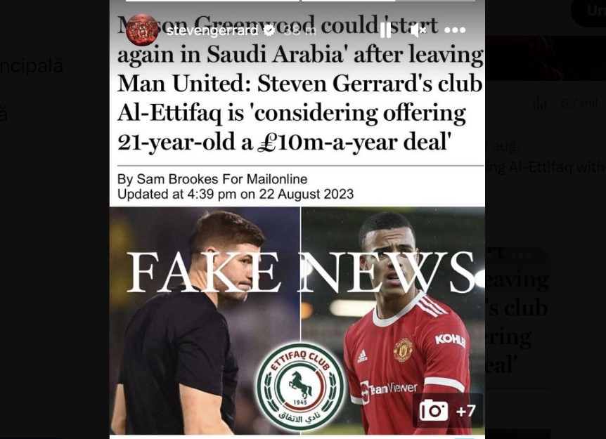 Ce urmează pentru Mason Greenwood? O vreme s-a vehiculat că fostul atacant ar fi în atenția echipei antrenate de Steven Gerrard, Al-Ettifaq și că saudiții i-ar fi făcut o ofertă de 10 milioane de euro. Gerrard, însă, a negat informația cu o simplă fotografie.
