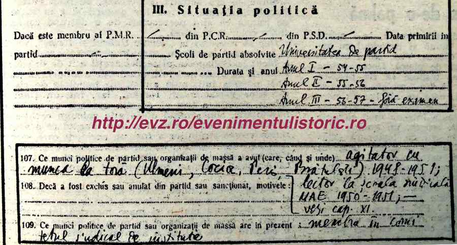 Există chiar o Fişă de cadre a lui Mihai Şora, publicată acum ceva vreme de „Evenimentul istoric”, în care se spune ce rol a avut filosoful în acei ani ai stalinismului, cînd era „agitator cu munca la ţară” între 1948-1951. „lector la şcoala sindicală” între 1950-1951, absolvind chiar „Universitatea de partid”, pe care a urmat-o între 1954-1957: