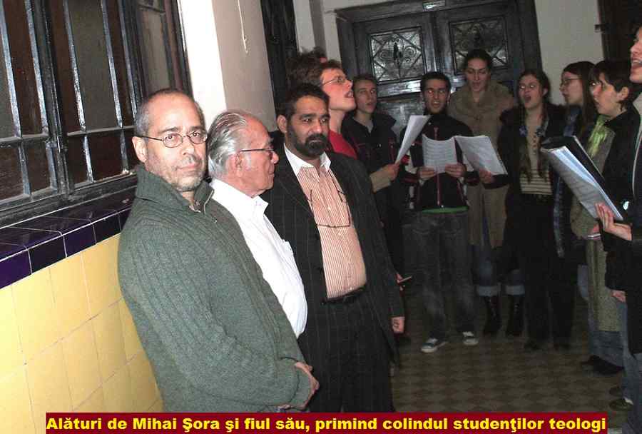 Întîlnirile cu Mihai Şora au fost – şi aşa rămîn! – privilegii de care nu mă dezic, fie că acestea aveau loc în grădina Casei Universitarilor din Craiova, fie la dînsul acasă, cum arată şi această fotografie din faţa uşii locuinţei sale din Bucureşti, cînd primeam împreună corul studenţilor de le teologie în preajma Crăciunului: