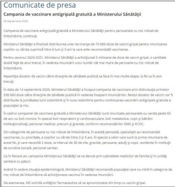 Pentru sezonul 2020-2021, Ministerul Sănătăţii a achiziţionat 3 milioane de doze de vaccin antigripal, o cantitate dublă față de anul trecut