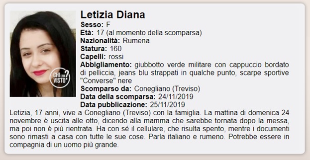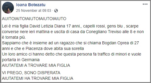 „Letizia Diana David este o fată de 17 ani, de origine română, care locuiește în Conegliano. De duminica trecută (25 noiembrie), familia sa nu a mai auzit de ea. Mama ei, Ioana, a lansat un apel disperat pe Facebook pentru a afla orice informații care să o facă pe fiica sa să vină acasă. Letizia, de fapt, nu a plecat de acasă, ea era în compania unui bărbat mai în vîrstă decât ea, un tânăr de douăzeci și șapte de ani venit din Germania”.