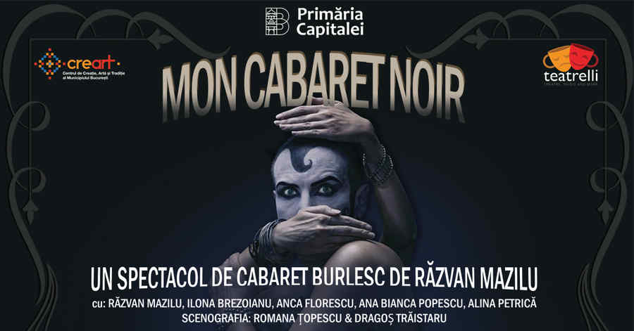 „Mon Cabaret Noir”, de Răzvan Mazilu – un spectacol total, cu teatru, coregrafie, muzică și foarte multă culoare – este programat pentru duminică, 3 mai, în cadrul seriei Teatrelli online și poate fi vizionat gratuit de publicul larg pe www.teatrelli.com, în intervalul orar 18.00 – 23.00.