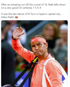 După o luptă admirabilă, Nadal s-a oprit după partida cu Jiri Lehecka, fiind eliminat, scor 5-7, 4-6.