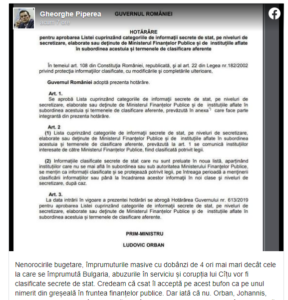 „Nenorocirile bugetare, împrumuturile masive cu dobânzi de 4 ori mai mari decât cele la care se împrumută Bulgaria, abuzurile în serviciu și corupția lui Cîțu vor fi clasificate secrete de stat”, acuză avocatul Gheorghe Piperea, prezentând o Hotărâre de Guvern în sprijinul afirmațiilor sale.