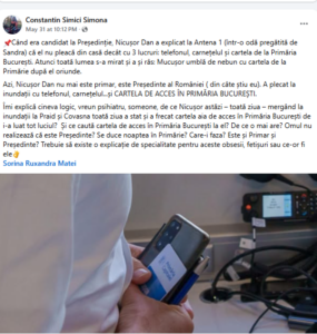 ”…toată ziua – mergând la inundații la Praid și Covasna toată ziua a stat și a frecat cartela aia de acces în Primăria București de i-a luat tot luciul? Și ce caută cartela de acces în Primăria București la el? De ce o mai are? Omul nu realizează că este Președinte? Se duce noaptea în Primărie? Care-i faza? Este și Primar și Președinte? Trebuie să existe o explicație de specialitate pentru aceste obsesii, fetișuri sau ce-or fi ele”.