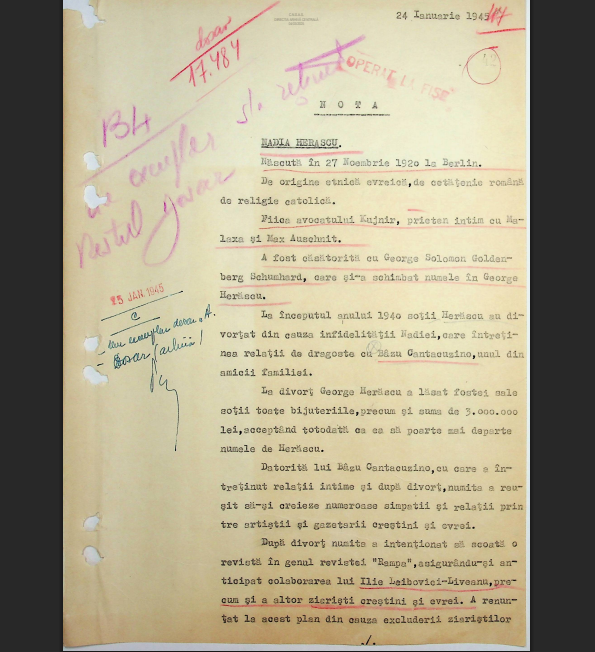 Sinteza despre ea, din data de 24 ianuarie 1945, ne spune că se născuse în 1930 ca fiică a avocatului evreu bogat Kujnir, dar fusese botezată catolică. S-a măritat foarte tânără cu omul de afaceri de succes George Solomon Goldenberg Schumhardt, devenit la un moment dat George Herăscu. Fiind plină de bani, juca de plăcere teatru, încuraja juni scriitori și artiști, voia să editeze reviste culturale. Din plictiseală, se încurcase cu pilotul Bâzu (Constantin) Cantacuzino și el complet căsătorit.