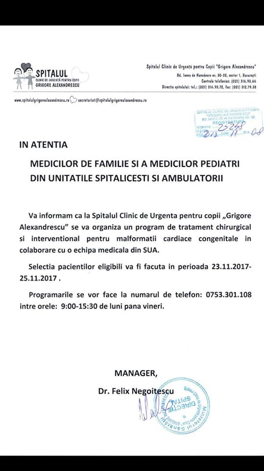 Medicii de familie și medicii pediatri sunt rugați de medicul Felix Negoițescu de la Spitalul de Urgență pentru Copii „Grigore Alexandrescu“ să informeze pacienții că se pot înscrie la programul de tratament chirurgical și intervențional pentru malformații cardiace congenitale desfășurat în colaborare cu o echipă din SUA.