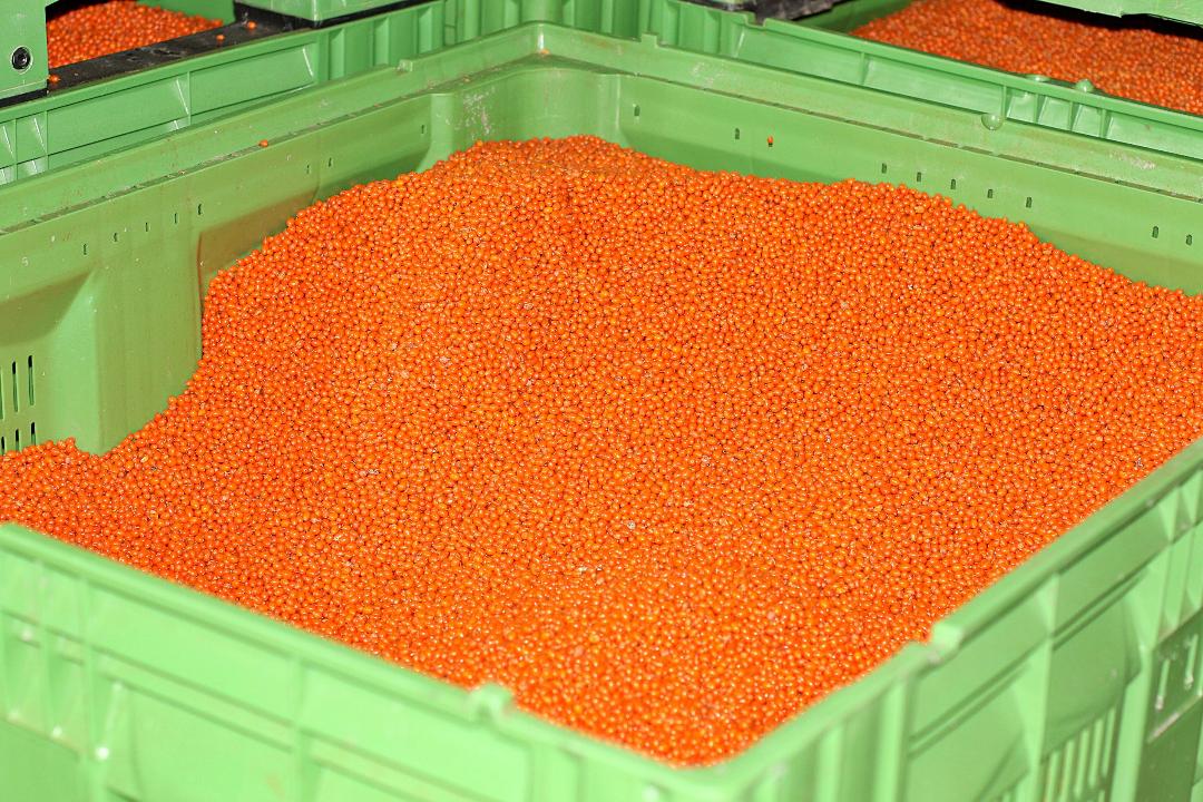 Detaliile însă fac diferenţa: cătina trebuie culeasă conform celor mai stricte reguli, mierea trebuie să fie ecologică şi apa folosită să fie alcalină. Cum trebuie culeasă? Chiar prin tăierea copacului de la aproximativ 80 cm de la sol, astfel încât fructele să rămână pe ramuri, apoi ramurile se taie si sunt puse cu fructele într-o hală, la minus 44 de grade Celsius. După ce au înghețat, fructele sunt scuturate cu un dispozitiv special, care le şi selectează pe dimensiuni cu ajutorul unui sistem de site, şi sunt depozitate într-o altă hala, de data aceasta la minus 20 de grade Celsius. Timp de un an, arborii tăiaţi se refac şi abia în anul următor vor putea da o altă producţie, astfel încât, anual, câte 25 de ha sunt recoltate alterantiv în ferma din Cojani.