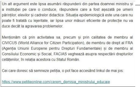 Iată mai jos textul integral al petiției prin care FACIAS solicită deminisia ministrului Monica Anisie: