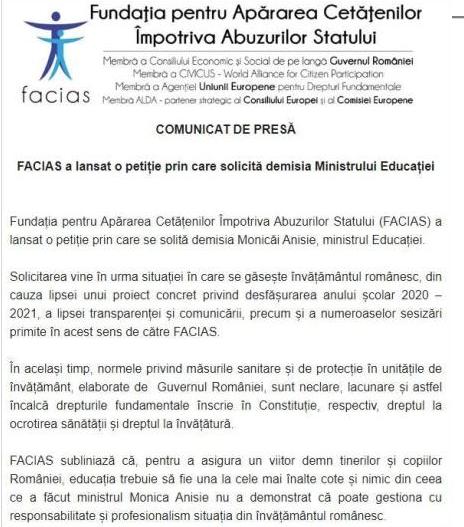 Printr-un comunicat trimis redacției noastre, FACIAS (Fundația pentru Apărarea Cetățenilor Împotriva Abuzurilor Statului) solicită demisia ministrului Educației, Monica Anisie. În acest sens, FACIAS a inițiat o petiție publică bazată pe numeroasele sesizări pe care le-a primit.