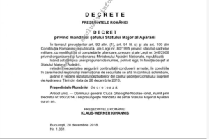 „Imediat după ședința Consiliului Suprem de Apărare a Țării, Decretul Președintelui României nr. 1331/2018, prin care s-a prelungit mandatul șefului Statului Major al Apărării, a fost transmis, în condițiile Legii nr. 202/1998, secretarului general al Camerei Deputaților, în vederea publicării în Monitorul Oficial al României.