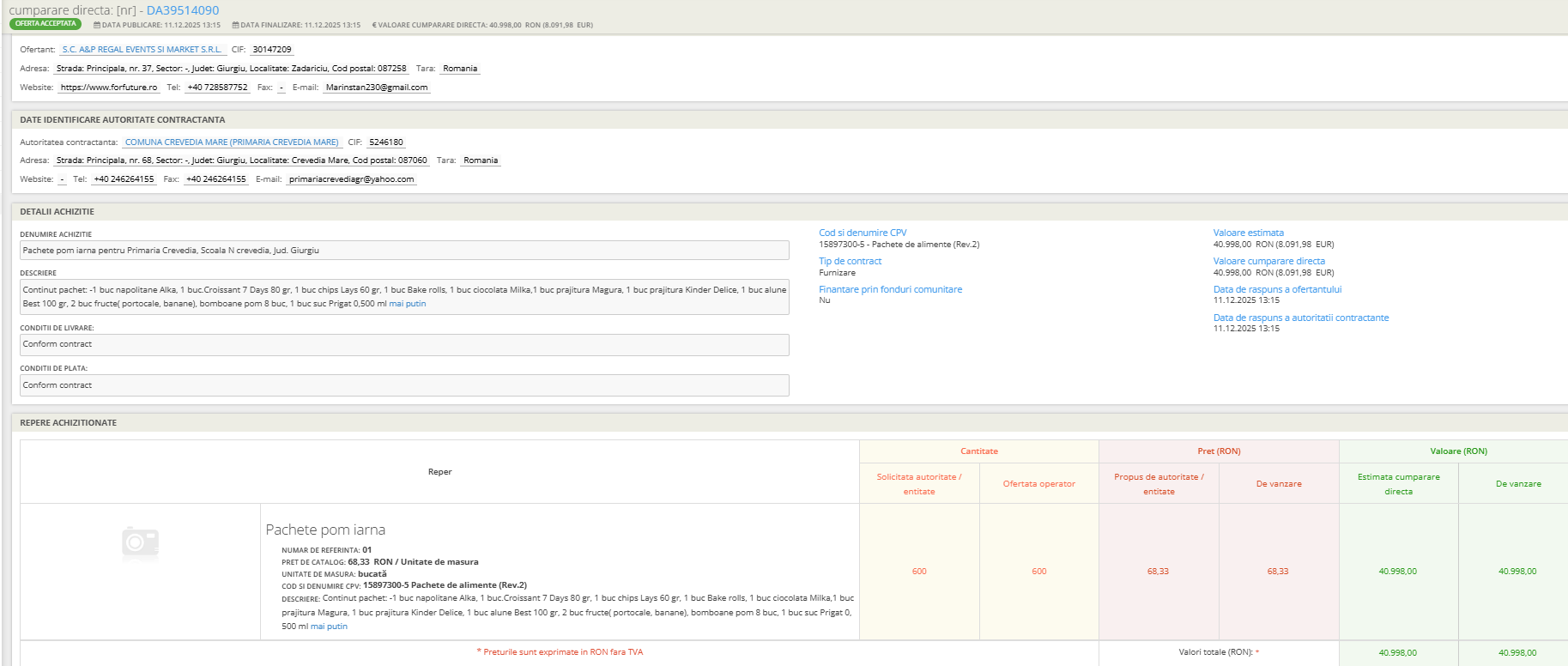 Primăria din Crevedia Mare a cumpărat în decembrie 2025, prin atribuire directă, 600 de pachete cu dulciuri pentru copii de la Școala Gimnazială Crevedia, în valoare totală de 40.998 lei fără TVA, adică de peste 9.000 de euro cu TVA.