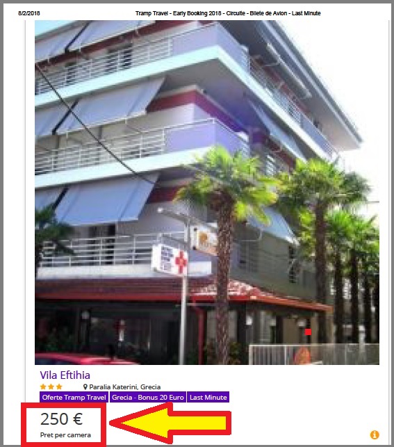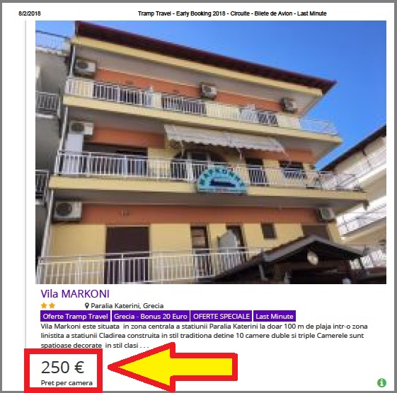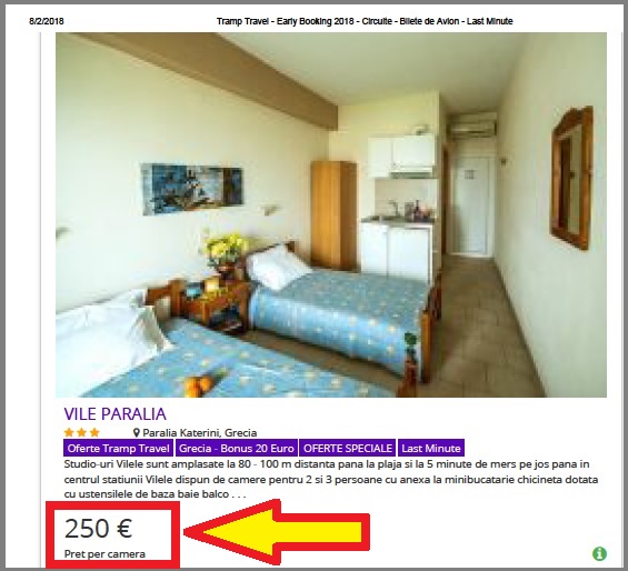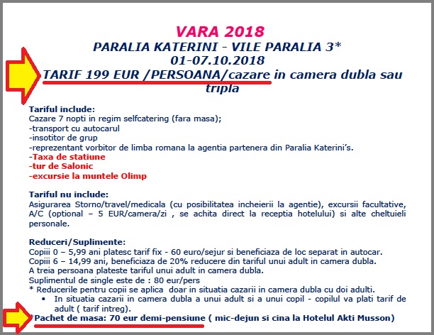 Este foarte simplu de constatat că în oferta oficială a firmei SC Tramp Travel International SRL turiştii care merg pe cont propriu în Paralia-Katerini, preţul unei camere este de 250 euro, deci două persoane ar plăti cîte 125 euro pentru cele 7 zile de cazare! Aşa cum veţi vedea mai jos, un pachet de masă costă 70 euro pe tot sejurul, ceea ce face ca suma totală pentru cazare şi masă în cele 7 zile să se ridice la 215 euro, faţă de 379 euro cît plăteşte Primăria Capitalei pentru fiecare din cei 1.000 de pensionari,adică mai mult cu 164 euro/persoană!