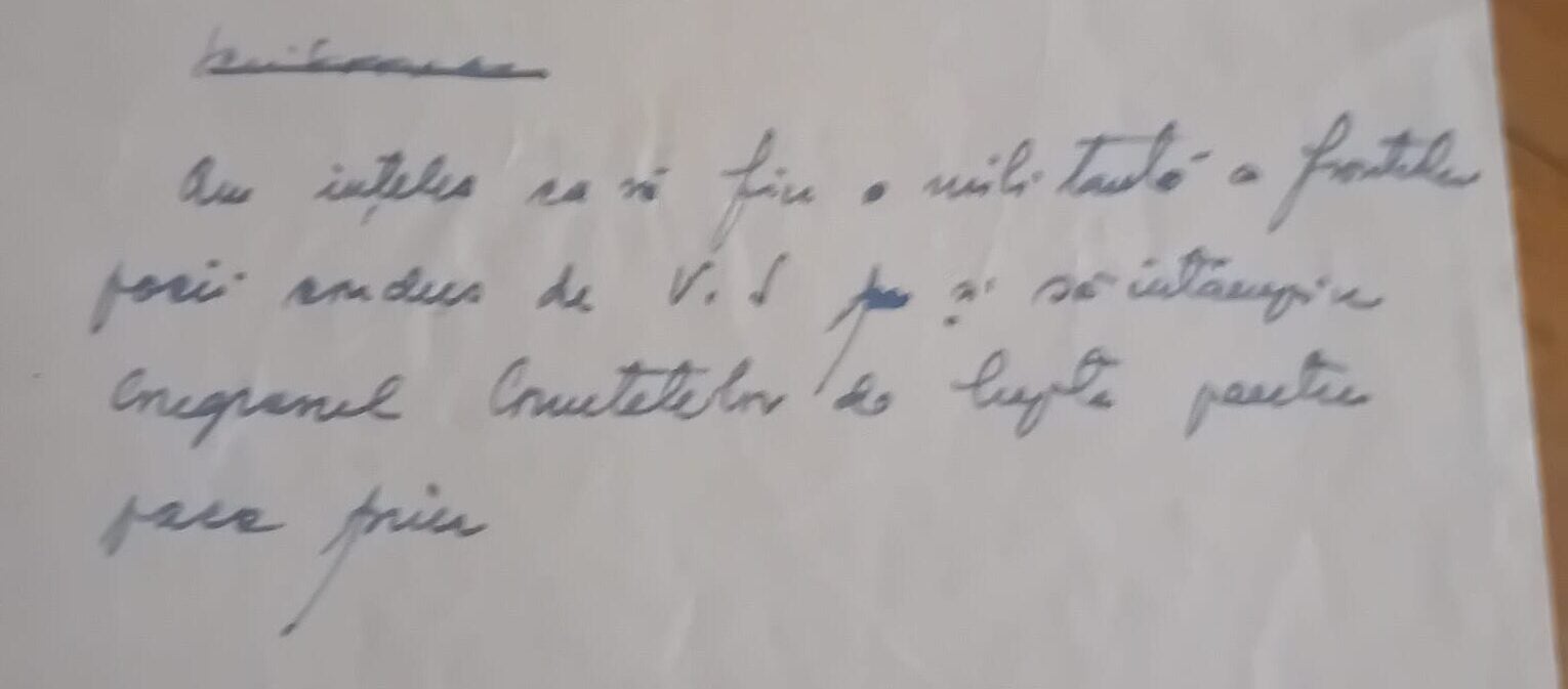 Am mai găsit în dosar începutul ciornei unui discurs al unei tovarășe rămasă anonimă pe care a părăsit-o brusc inspirația: „Am înțeles ca să fiu o militantă a frontului păcii condus de Uniunea Sovietică și să întâmpin Congresul Comitetelor de luptă pentru pace prin”. Prin ce? Prin vigilență împotriva dușmanului de clasă?