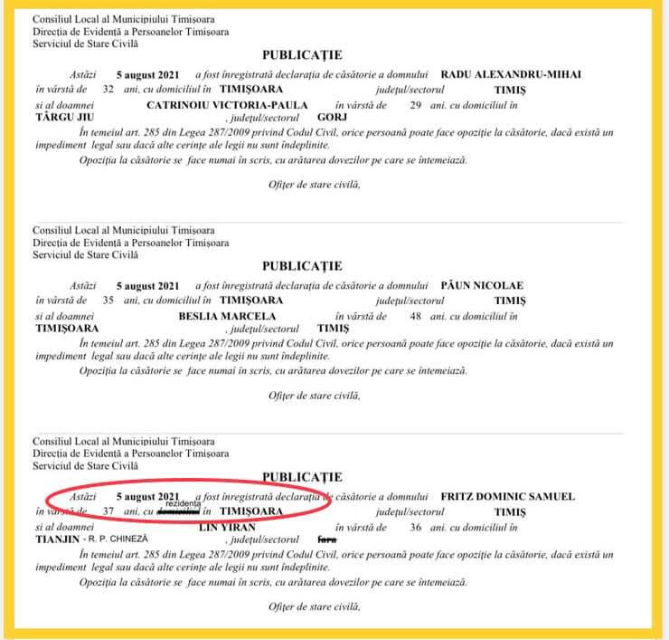 Fostul edil, care a publicat şi o fotografie cu anunţul căsătoriei lui Dominic Fritz.