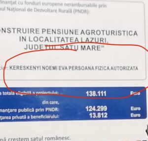 A fost greu de înțeles logica acestor vânzări și cumpărări până în data de 3 iulie 2020, când, ce să vezi, distinsa doamnă Noemi Eva Kereskenyi, nimeni alta decât soția primarului cu același nume, a cumpărat aceeași parcelă de 3578 mp, de la Episcopia Romano Catolică, cu suma de 65.000 euro. Putem zice că leii din prețul record inițial au devenit euro după numai trei ani. Binînțeles nu din salar, pentru că în 2020 a încasat în total 64.559 lei, adică în jur de 5.380 lei pe lună, ci dintr-un împrumut de 70.000 de euro de la o persoană fizică. Soția primarului era și este angajata companiei APASERV SA Satu Mare, operatorul de apă și canalizare al municipiului și județului Satu Mare, la care Consiliul Local este acționar alături de Consiliul Județean. Fiind multilateral pregătită, a fost promovată ulterior șef serviciu comunicare și relații cu publicul, având actualmente un salariu lunar net de 9.500 lei, conform declarației de avere a soțului său. Foarte norocoasă această familie Kereskenyi, care a beneficiat peste noapte de contracte de donație pe terenuri, clădiri și bani, respectiv pe suma de 94.394 lei. Colac peste pupăză, familia primarului a câștigat în 2018 un proiect de finanțare de 138.111 de euro pentru o pensiune construită în Lazuri, localitate situată la 6 km de Satu Mare.