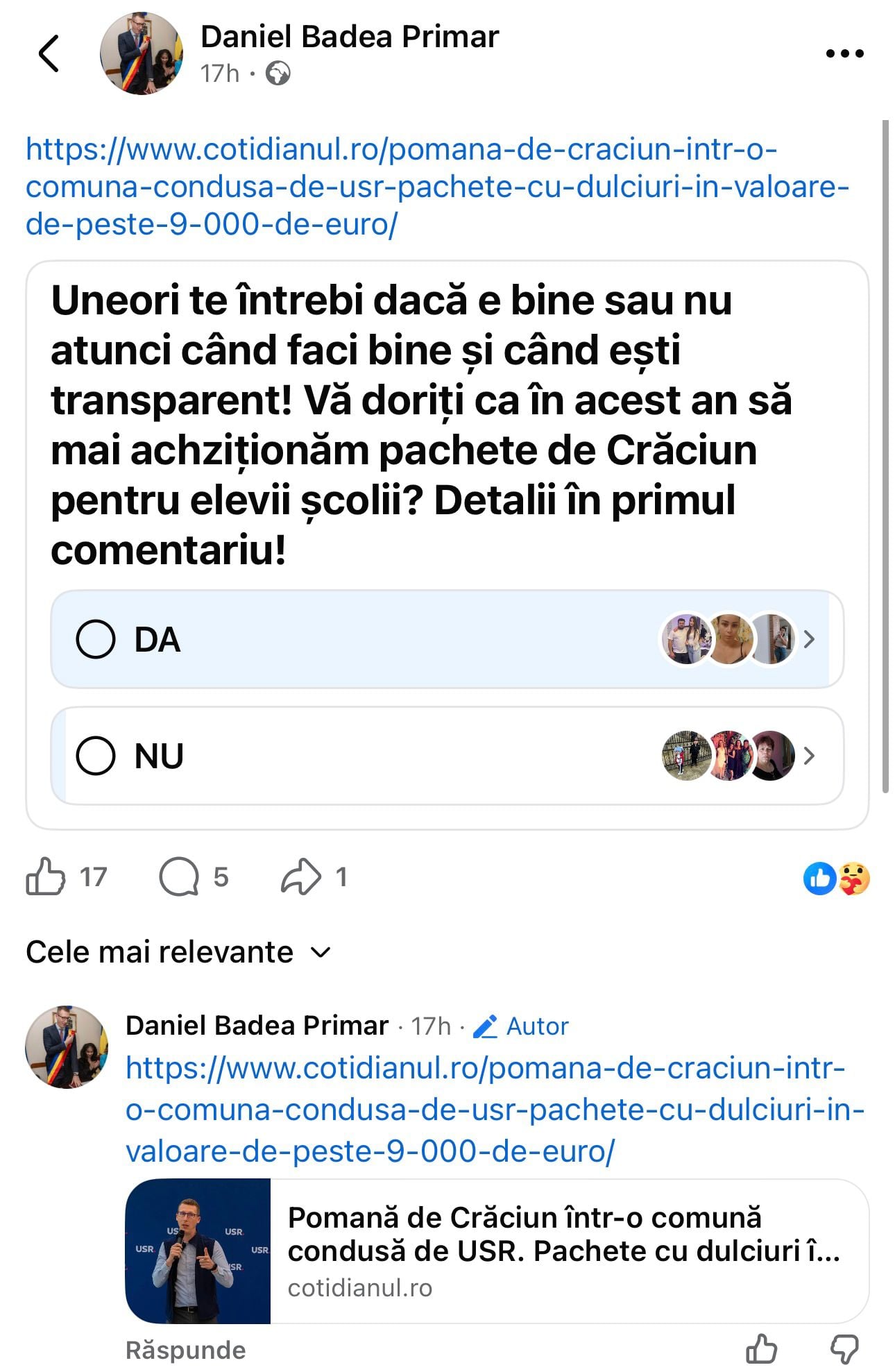 Primarul din comuna giurgiuveană cu sub 5.000 de locuitori a dat drumul la un sondaj pe pagina sa de Facebook, alături de articolul din Cotidianul, prin care îi întreabă pe locuitorii din Crevedia Mare dacă își doresc ca și în acest an primăria să le ofere pachete cu dulciuri copiilor de Crăciun.