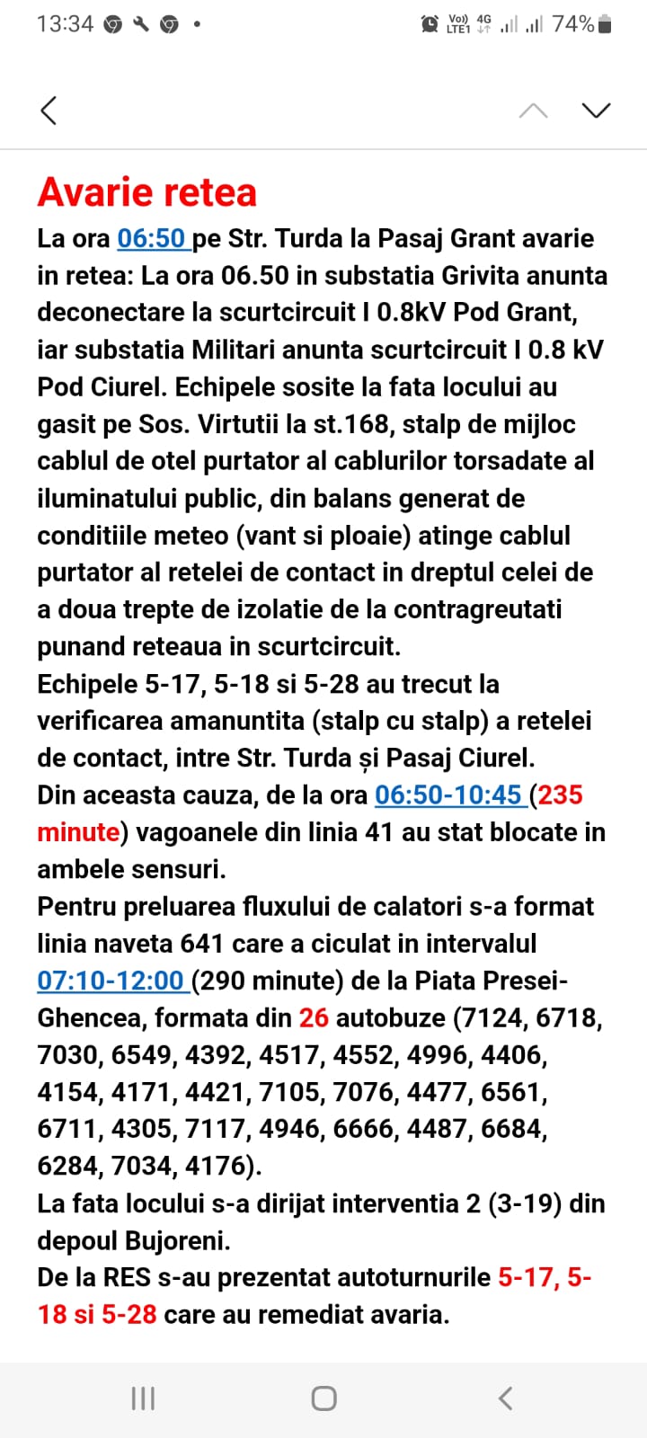 Astăzi 14.07.2023, la ora 06:48 pe traseul liniei 41 în zona podului Ciurel s-a întrerupt alimentarea cu tensiune a liniei de contact.