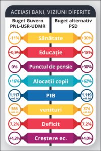 Potrivit proiectului de buget al PSD, Sănătatea ar urma să primească 30%, în loc de 11%, iar Educația 18%. Sume mai mari sunt alocate și pentru punctul de pensie și alocațiile copiilor.