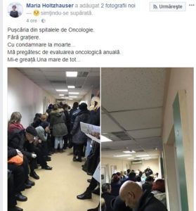 Situația gravă de pe holurile Institutului Onclogic Fundeni, unde zeci de oameni așteaptă la coadă, în picioare, ore bune, a fost surprinsă în două poze apărute pe rețelele de socializare. Cea care le-a postat, Maria Holtzhause, a scris în mesajul său: