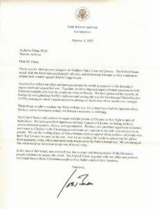 Va multumesc pentru gandurile trimise referitoare la razboiul lui Vladimir Putin impotriva Ucrainei. Statele Unite sustin mandrul si bravul popor Ucrainian in lupta sa pentru liberate si democratie si in efortul de aparare a tarii contra agresiunii Rusiei.