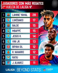 Acest lucru reiese și dintr-un foarte interesant top de pe Platforma X despre jucătorii care au reușit cele mai multe driblinguri de la începutul acestui an în La Liga și remarcăm cu surprindere prezența lui Andrei în Top 10.