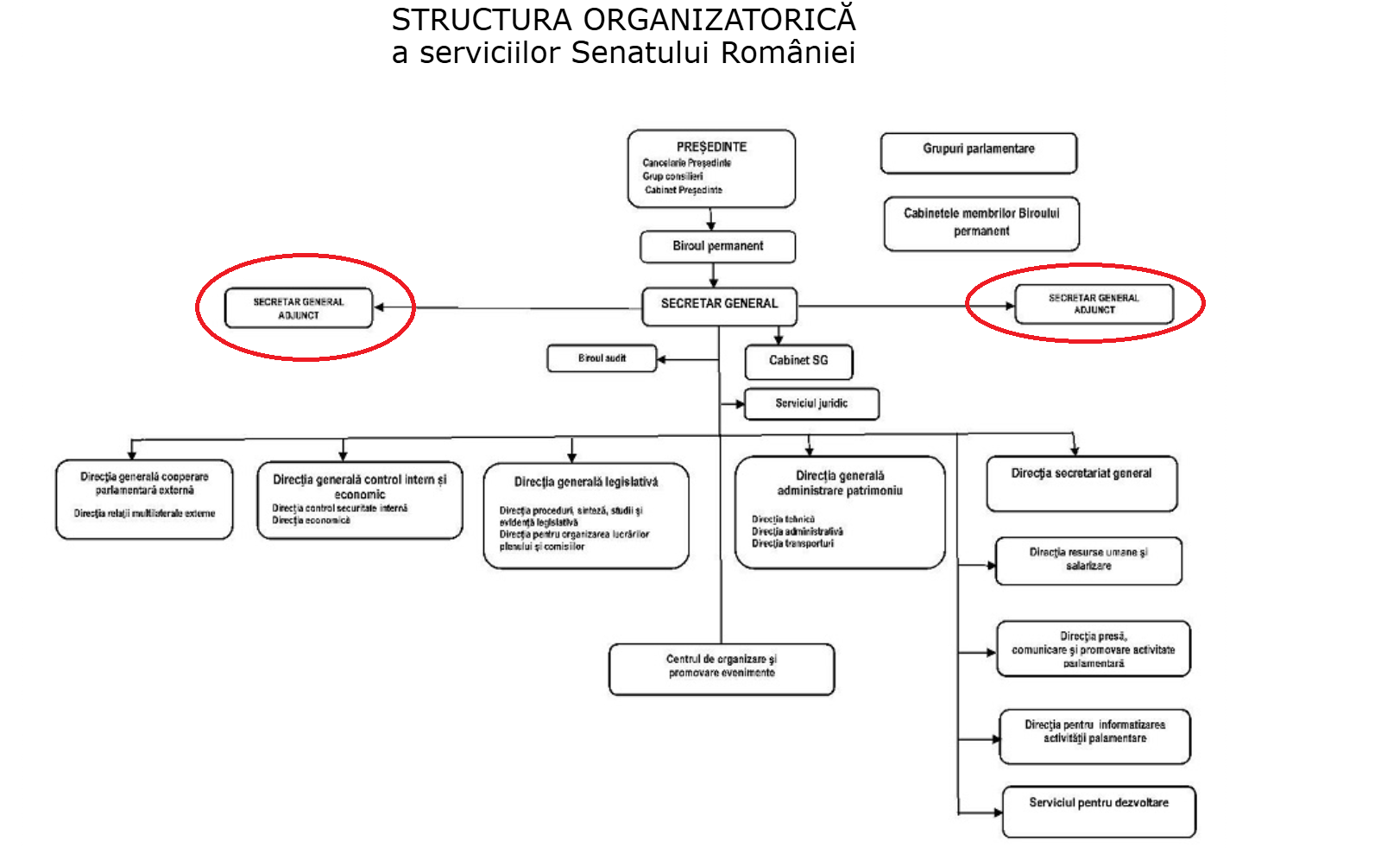 Două zile mai târziu, pe 3 februarie 2025, Senatul a adoptat Hotărârea 5 privind structura serviciilor Senatului. La articolul 3, alineatul 2 este stipulat faptul că „în activitatea sa, secretarul general al Senatului este ajutat de doi secretari generali adjuncți”. Mai mult, hotărârea are anexată și organigrama, care prevede două posturi de secretar general adjunct.