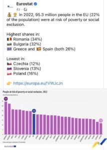 Aceasta e cea mai mare rușine a guvernanților României de după 2007, de când România a devenit un fel de membru de categoria C a UE: suntem “campionii” UE la risc de sărăcie și de excluziune socială, conform Eurostat.