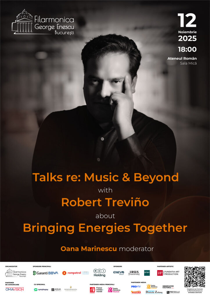 Filarmonica George Enescu invită publicul la un eveniment special miercuri, 12 noiembrie, la Sala Mică a Ateneului Român, unde dirijorul Robert Treviño va participa la o discuție despre cum putem aduce energiile împreună în muzică și în viața de zi cu zi. Tema întâlnirii, Bringing Energies Together, propune un dialog despre cooperare, respect reciproc și libertatea de exprimare a ideilor, într-un context social tot mai polarizat. Participarea este gratuită, iar înregistrarea se face prin completarea unui formular online.