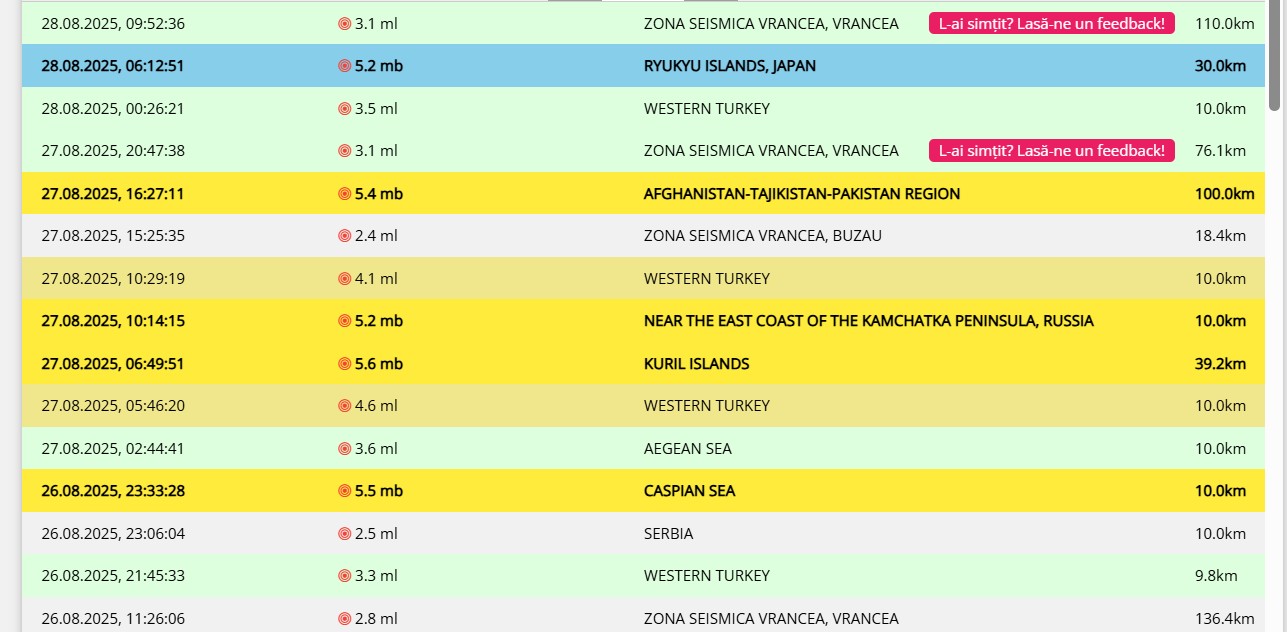 Cinci cutremure în patru zile au avut loc în România. Cel mai recent s-a produs în această dimineață  la ora 09:52:36 (ora locală a României) în ZONA SEISMICA VRANCEA. Mișcarea telurică a avut magnitudinea ml 3.1, și s-a produs la adâncimea de 110.0 km.