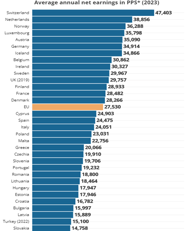 1. Toți cei care spun că salariile în România nu sunt corelate cu productivitatea muncii greșesc sau mint cu bună știință, căci, iată, la nivelul salariului mediu (18 800 euro PPS anual în 2023) suntem mult sub Polonia (23 000 euro PPS), Grecia (20 000 euro PPS) sau Portugalia (19 200 euro PPS), deși avem o productivitate superioară respectivelor economii. Avem, deci, suficient spațiu de creștere pentru salarii.
