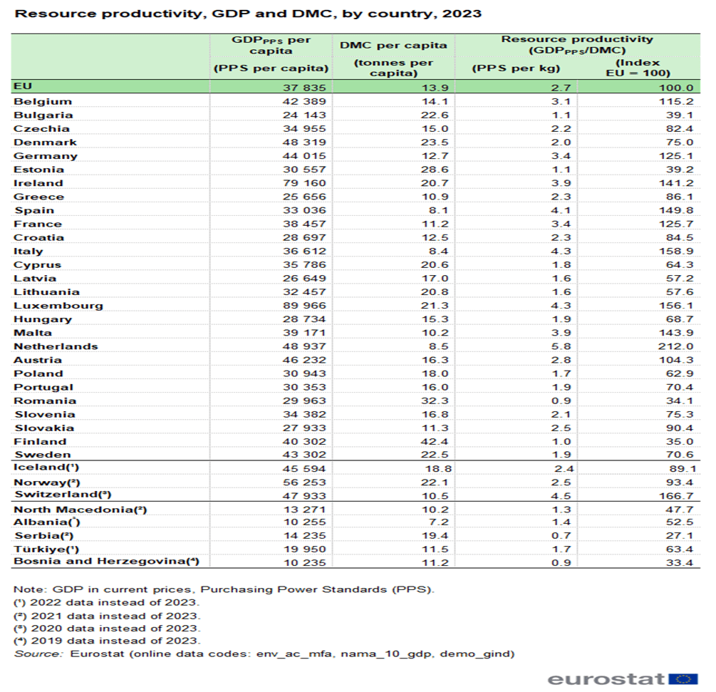 Productivitatea (utilizării) resurselor este, practic, un indicator privind nivelul de dezvoltare și de sofisticare al economiei. Expresia sa matematică este raportul dintre PIB/locuitor (la standardul puterii de cumpărare, deci în cifre comparabile) și consumul material intern (DMC- domestic material consumption). Deci, cu cât o economie produce mai mulți bani dintr-o cantitate dată de resurse consumată, cu atât este mai productivă.
