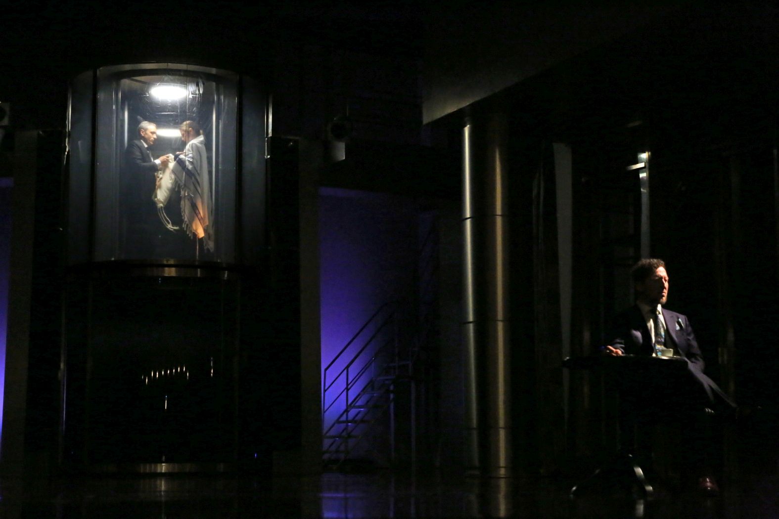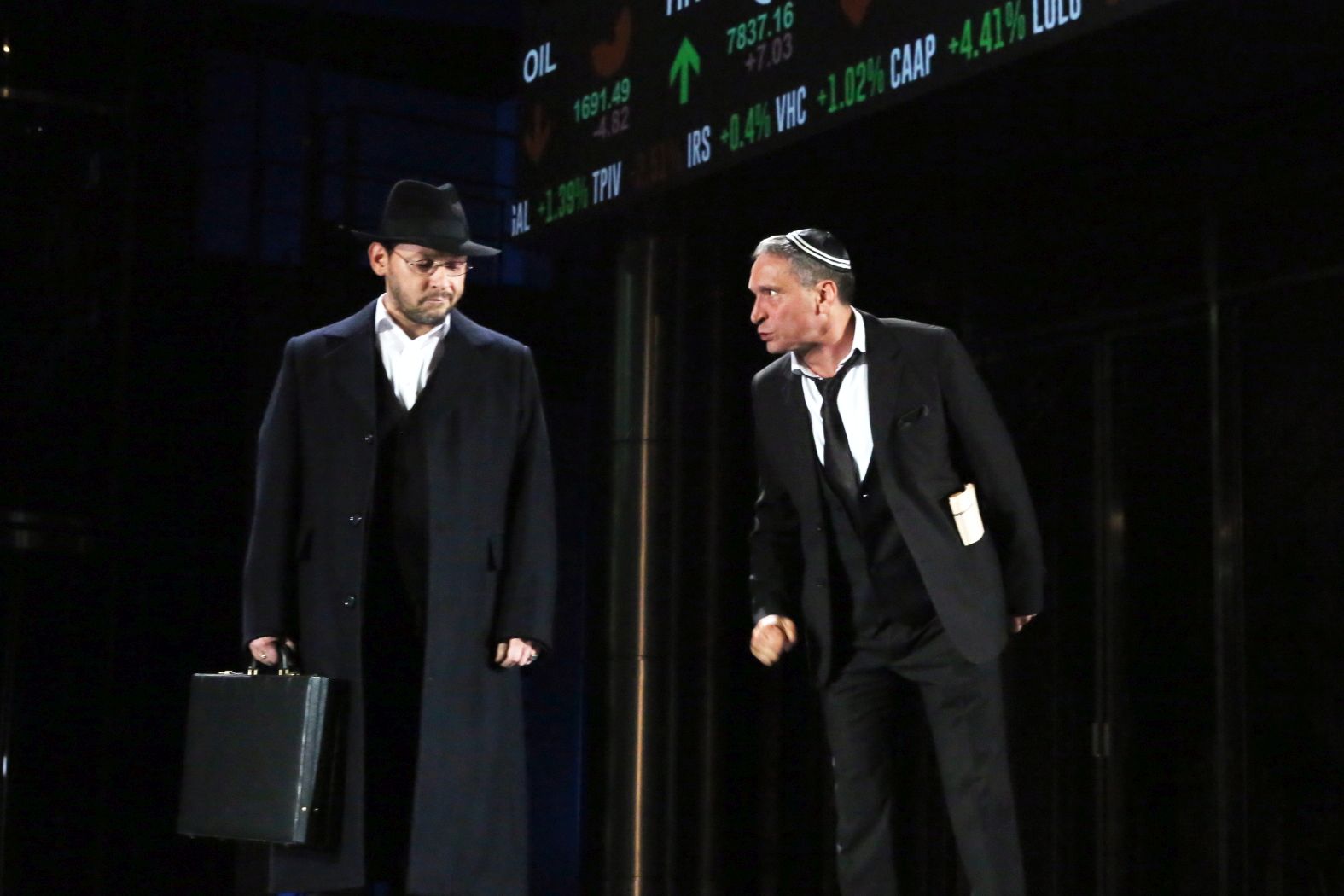 În noaptea sălii, când Jessica, fiica lui Shylock care l-a părăsit e părăsită la rândul ei, pe scenă apar lumânări ca într-un vechi ritual evreiesc şi spectacolul, astfel, reface legătura cu începutul: Wall Street-ul e o paranteză şi ceea ce contează e această apartenenţă la identitatea originară. La Peter Sellars se aprindeau stele pe cer, aici se aprind candele.