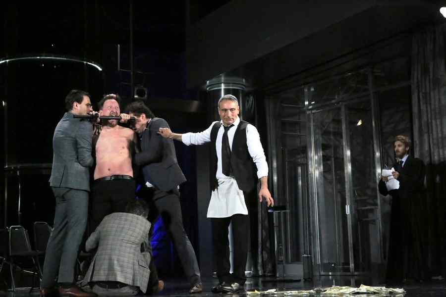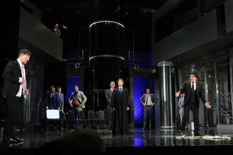 Neguţătorul din Veneţia al lui William Shakespeare l-am văzut prima oară în anii 90, când la Paris Ştefan Iordache, acompaniat de Alexa Visarion, recita monologurile regilor shakespearieni la teatrul Odéon, iar eu îl abandonam în seara finală pentru a mă duce la spectacolul semnat de Heiner Müller care-l plasa pe Shylock, evreul sfâşiat, în contextul capitalist al lui Deutsche Bank, noua putere întronizată după căderea comunismului. Actualizare violentă, dar de o forţă devastataore: lupta religioasă devenea aici  o luptă financiară. Mai târziu, Peter Sellars, într-o versiune memorabilă, a operat o altă „conversiune” făcând din protagonistul semit un capitalist negru: de astă dată conflictul devenea rasial! Şi răspundea în mod explicit tensiunilor americane actuale! Alte spectacole au insistat pe „integrarea” diferenţei evreieşti ca o formă de apărare, ca o asumare a condiţiei de exclus a lui Shylock, redus la un ansamblu de stigmate stereotipe: în spectacolul lui Bernad Soble, el îşi punea o masca de evreu cu „nas coroiat”, în acela al lui Andrei Şerban îşi asuma tragic condiţia, iar în acela al lui Ilan Ronen, văzut la Cluj, în cealaltă ediţie a festivalului Interferenţe,  pleca pe drumul exilului ca un „evreu rătăcitor” al timpurilor moderne. Splendoarea teatrului vine şi din jocul comparaţiilor între „acelaşi” text şi „diferenţa” răspunsurilor! E ceea ce am resimţit de astă dată  la Cluj când asistam la Neguţatorul în versiunea lui Gabor Tompa şi Dragoş Buhagiar, cu Bogdan Zsolt în rolul protagonistului. O nouă ipoteză, puternică şi legitimă! Un Shylock plasat în templul finanţei, Wall Street!