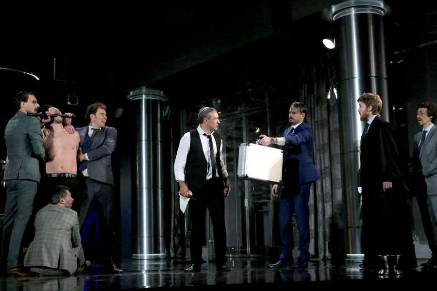Spectacolul lui Tompa debutează printr-o serie de cântece evreieşti tradiţionale: pătrundem astfel într-o lume plasată sub semnul unei identităţi spirituale profund asumate. Lume arhaică, concentrată asupra ei înseşi, dar, apoi, brusc înlocuită de cea tehnologică şi glacială a Wall Street -ului. Acolo se fac tranzacţiile actuale, dar nu se uită vechile opoziţii de confesiune: specatcolul le îngemănează constant. Shylock domină acest regat al finanţei în timp ce Antonio e stăpân al mărilor. El apare ca un personaj frivol şi seducător, în timp ce Shylock se concentrează asupra lui însuşi şi a fetei sale, Jessica… două lumi care se înfruntă! Ireconciliabile!