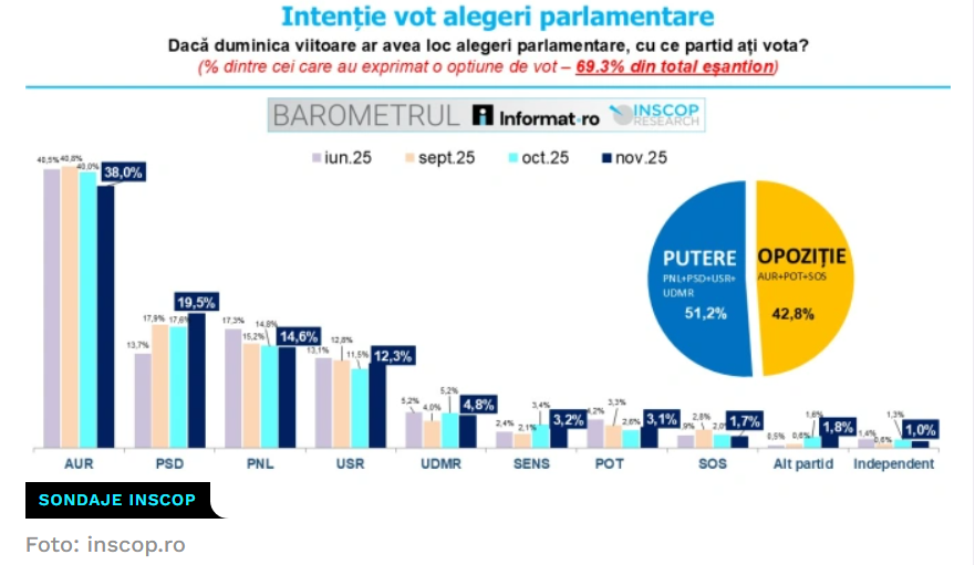 Singurele formațiuni care au înregistrat o creștere față de sondajul anterior, din octombrie 2025, sunt PSD (1,9%) și USR (0,8%).
