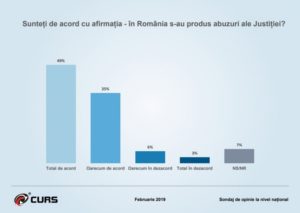 La întrebarea „Sunteţi de acord cu afirmaţia – în România s-au produs abuzuri ale Justiţiei?”, 49% dintre repondenţi s-au declarat „total de acord”, iar 35% s-au declarat „oarecum de acord”.