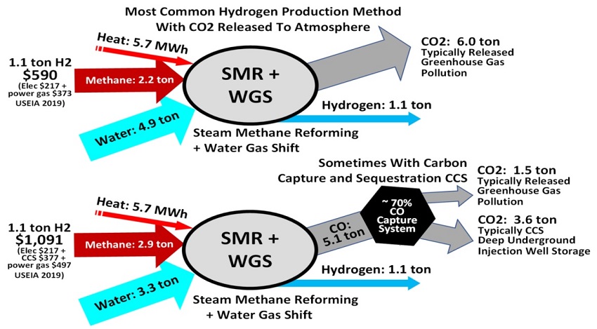 Tehnologia SMR fără CCUS implică emisii mari de CO2, estimate la 6 tone pentru 1,1 tone de H2, aşa cum se observă din figura de mai sus, hidrogenul rezultat numindu-se H2 gri. Dacă se face captarea şi stocarea carbonului prin injecţia în subteran, în zăcămintele epuizate de gaz metan, rezultă un H2, numit albastru, cu emisii de CO2 eliberat în atmosferă de numai 1,5 tone. Strategia hidrogenului prevede înlocuirea treptată a acestora cu H2 din surse regenerabile, deoarece arde fără emisii de CO2 asociate.