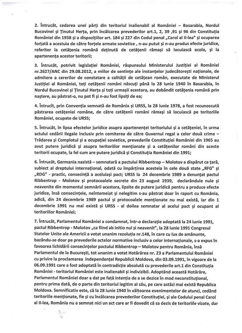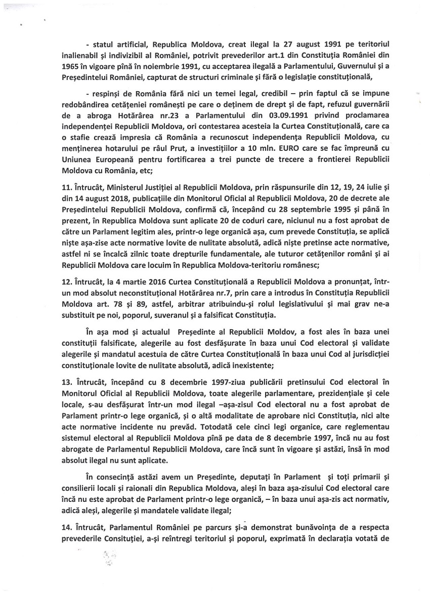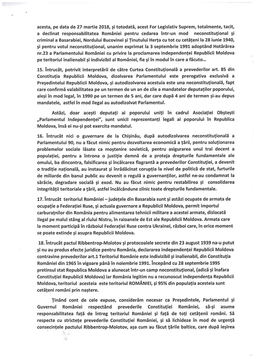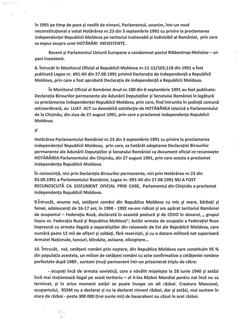 – consideră ca fiind pe deplin legitimă dorinţa acelor cetăţeni ai Republicii Moldova care susţin unificarea celor două state ca o continuare firească în procesul de dezvoltare şi afirmare a naţiunii române şi subliniem că acest act depinde de voinţa acestora,