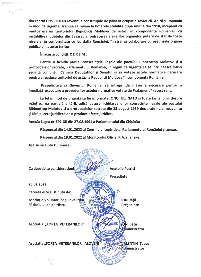 Astăzi, printr-un alt combatant, de data asta din România, am primit o nouă scrisoare a patrioților moldoveni, adresată președintelui României, Parlamentului și Guvernului, semnată de o asociație civică și de trei asociații ale veteranilor, luptătorilor și invalizilor din Războiul de pe Nistru. Îmi fac o datorie să o public, socotind acest gest inclusiv o formă de sprijin personal.