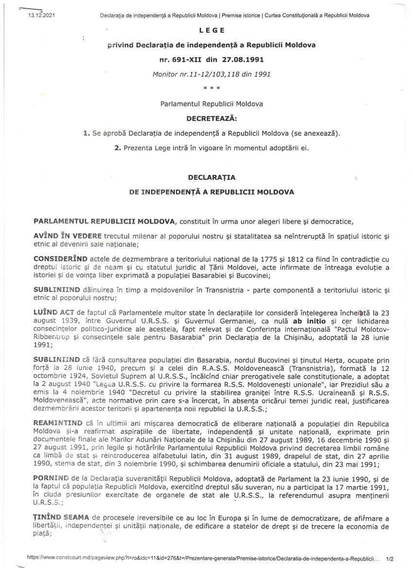 „În numele poporului Basarabiei, Sfatul Ţării declară: Republica Democratică Moldovenească (Basarabia) în hotarele ei dinspre Prut, Nistru, Dunăre, Marea Neagră şi vechile graniţe cu Austria, ruptă de Rusia acum o sută şi mai bine de ani, din trupul vechii Moldove, În puterea dreptului istoric şi a dreptului de neam, pe baza principiului ca noroadele singure să-şi hotărască soarta lor, de azi înainte şi pentru totdeauna se uneşte cu mama sa România. Trăiască unirea Basarabiei cu România de-a pururi şi totdeauna!”