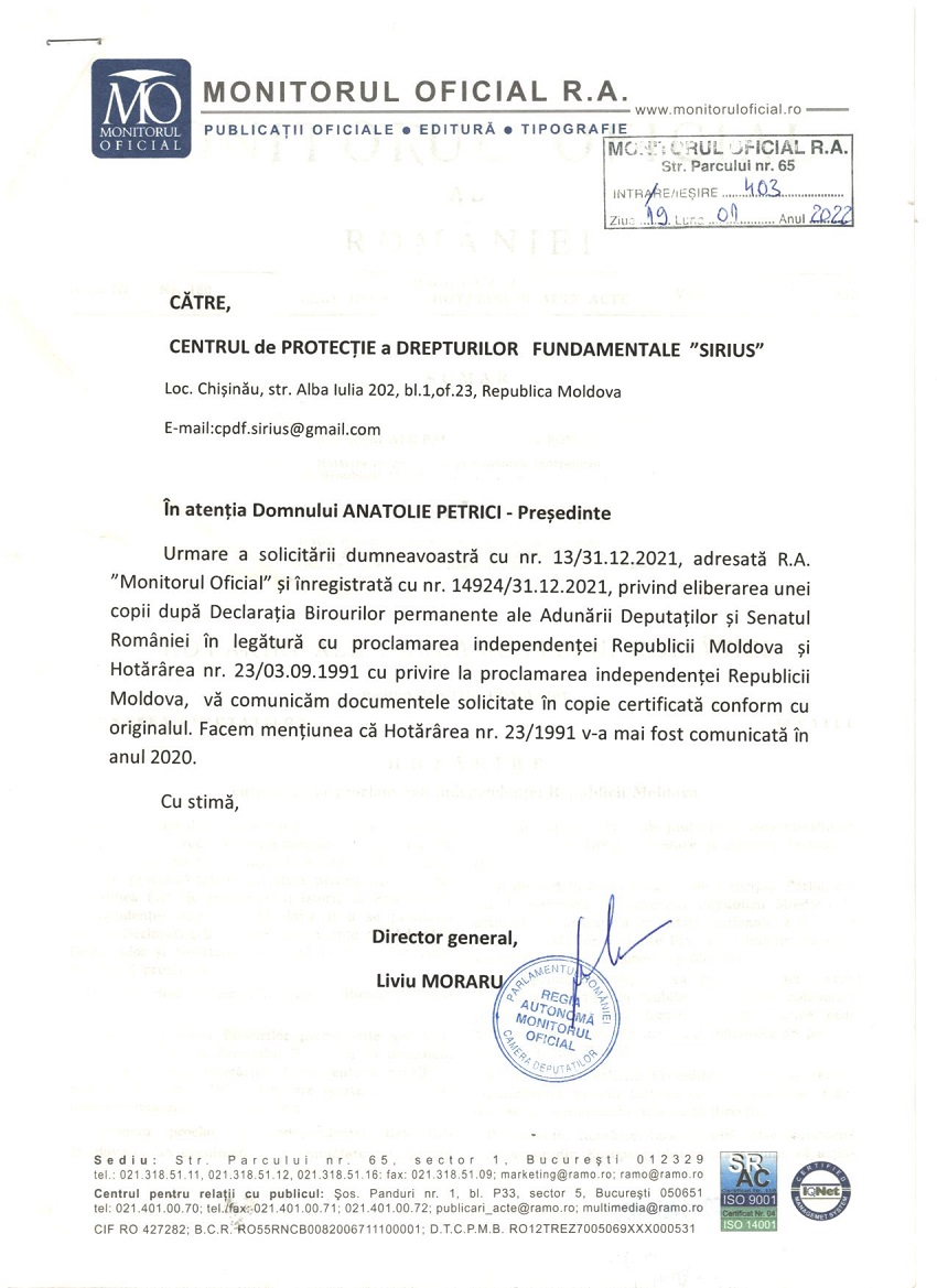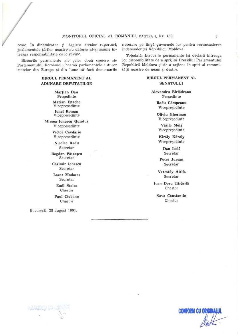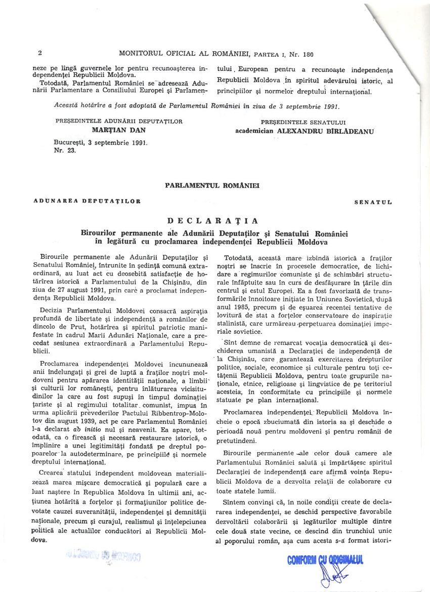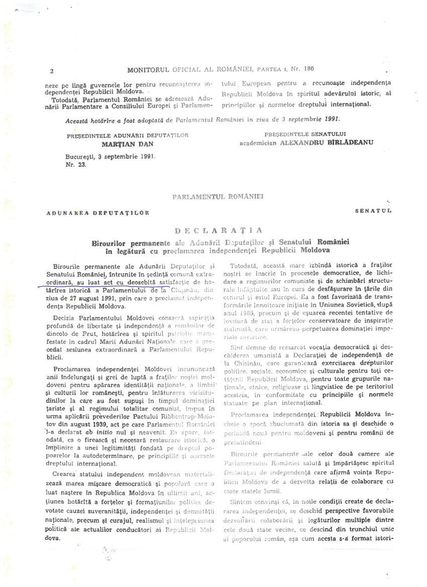 – declară că România şi cetăţenii ei sunt şi vor fi întotdeauna pregătiţi să vină în întâmpinarea oricărei manifestări organice de reunificare din partea cetăţenilor Republicii Moldova, ca o expresie a voinţei suverane a acestora.”