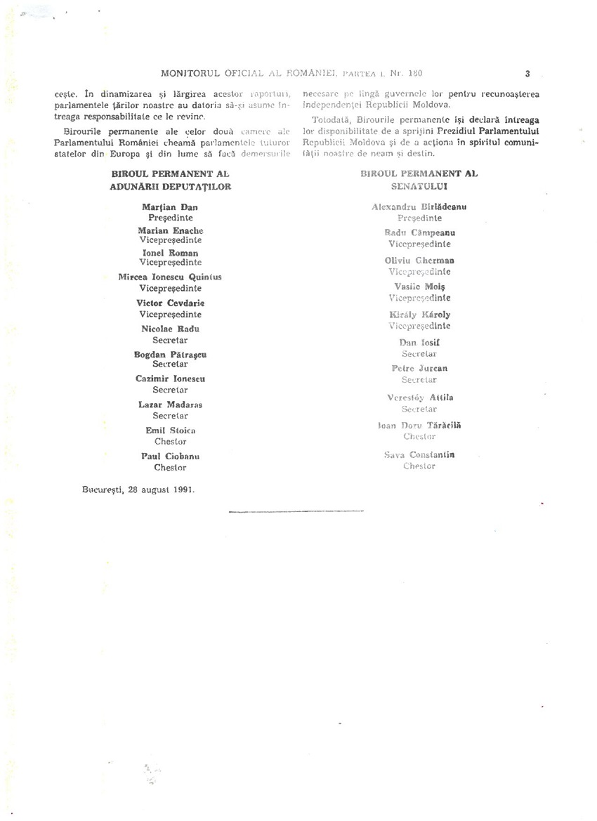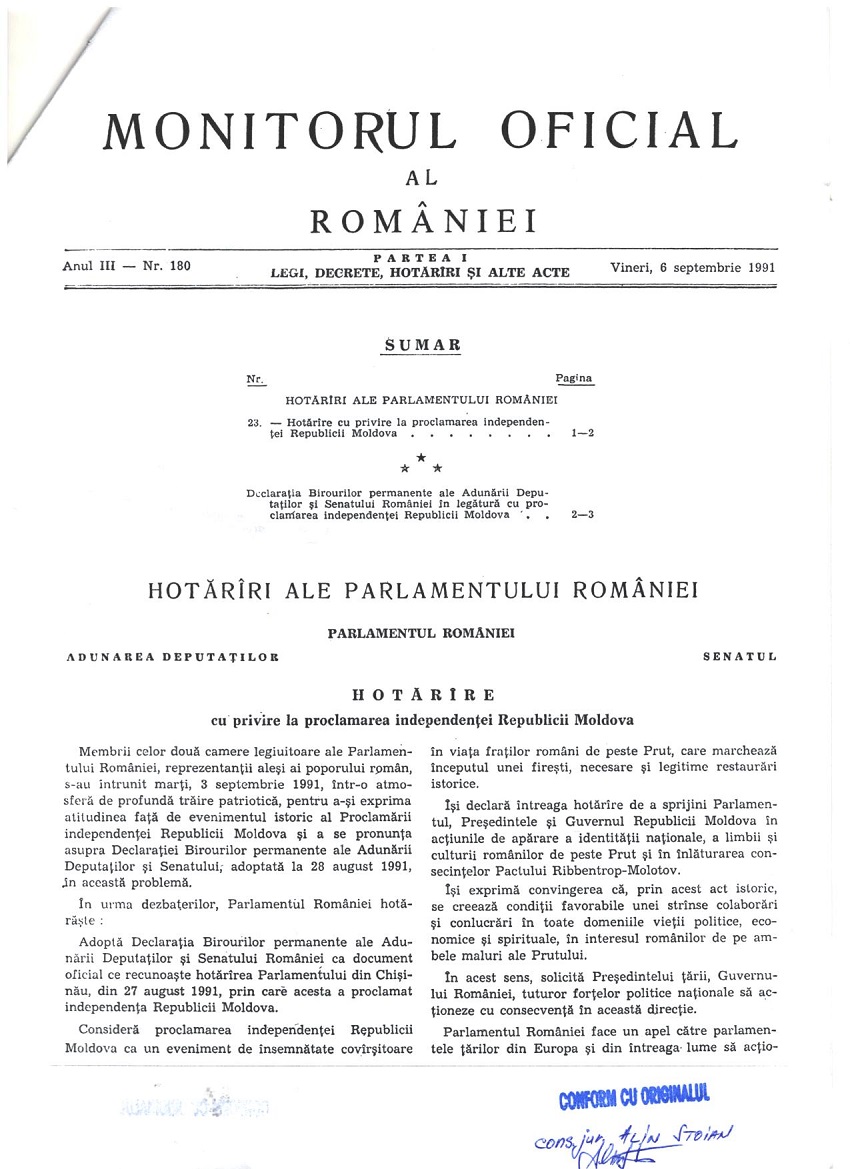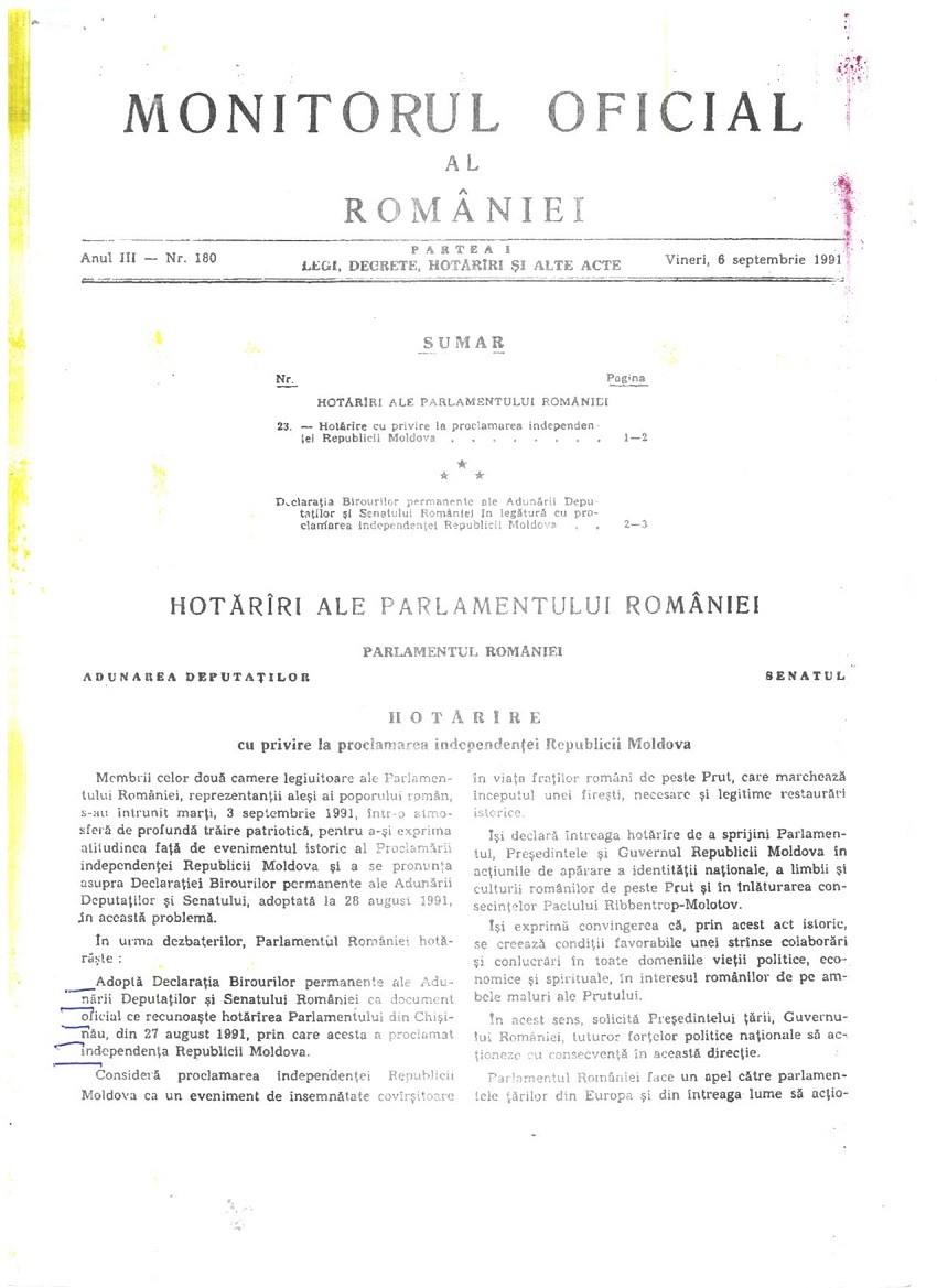 – Parlamentul României a condamnat, într-o Declaraţie adoptată la 24 iunie 1991, Pactul Ribbentrop-Molotov „ca fiind ab initio nul şi neavenit“;