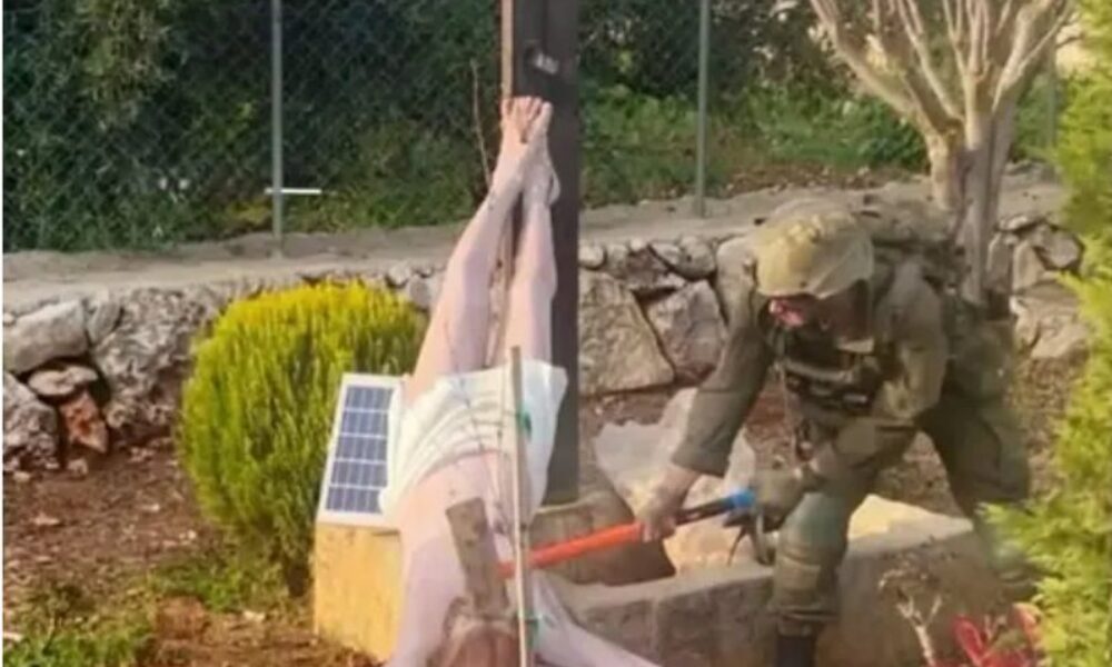 Imaginea arată un soldat israelian folosind un ciocan pentru a lovi capul unei statui a lui Iisus răstignit, care a căzut de pe cruce.