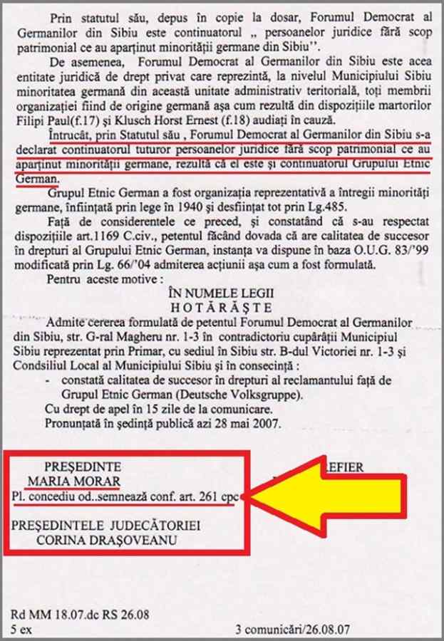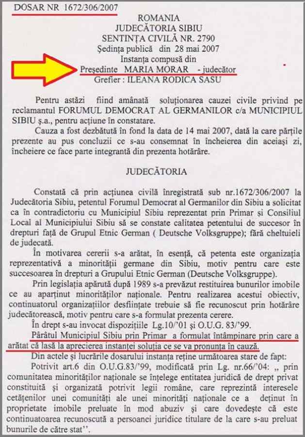 Pe prima pagină a acestei sentiţe se observă referirea la întîmpinarea depusă de primarul Sibiului, prin care „lasă la aprecierea instanţei soluţia”, renunţînd astfel la rolul activ pe care trebuia să-l aibă, fiind vorba despre un patrimoniu uriaş al statului şi al Primăriei pe care o conducea! Or, acest primar era chiar Klaus Iohannis, care deţinea şi funcţia de preşedinte al FDGR!