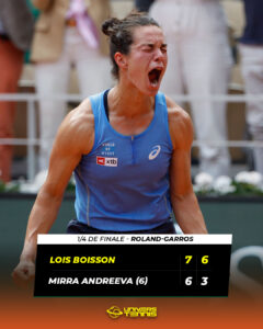 Astfel, la două zile după ce trecuse de favorita nr. 3, americanca Jessica Pegula, Boisson s-a impus acum după o partidă de două ore și zece minute în fața rusoaicei Andreeva, în vârstă de 18 ani, la rândul ei o revelație, care nu pierduse niciun set la actuala ediție de la Roland Garros și egalase performanța reușită de elvețianca Martina Hingis în 1997 și 1998.
