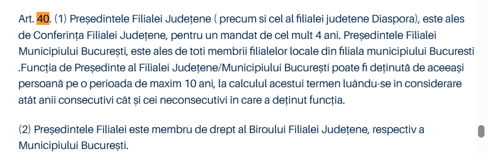Totodată, art. 25 alin. (2) din statut prevedea și că funcția de președinte a unei filiale poate fi deținută de aceeași persoană pe o perioadă de maximum 10 ani.