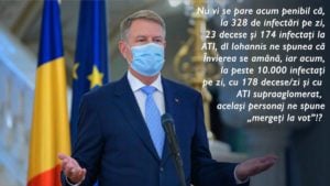 Nu vi se pare acum penibil că, la 328 de infectări pe zi, 23 decese și 174 infectați la ATI dl Iohannis ne spunea că Învierea se amână, că nu putem lua lumină și nici nu ne putem întâlni cu rudele? Nu vi se pare la fel de ridicol că acum, la peste 10.000 infectați pe zi, cu 178 decese/zi și cu ATI supraaglomerat, același personaj ne spune „mergeți la vot”!?