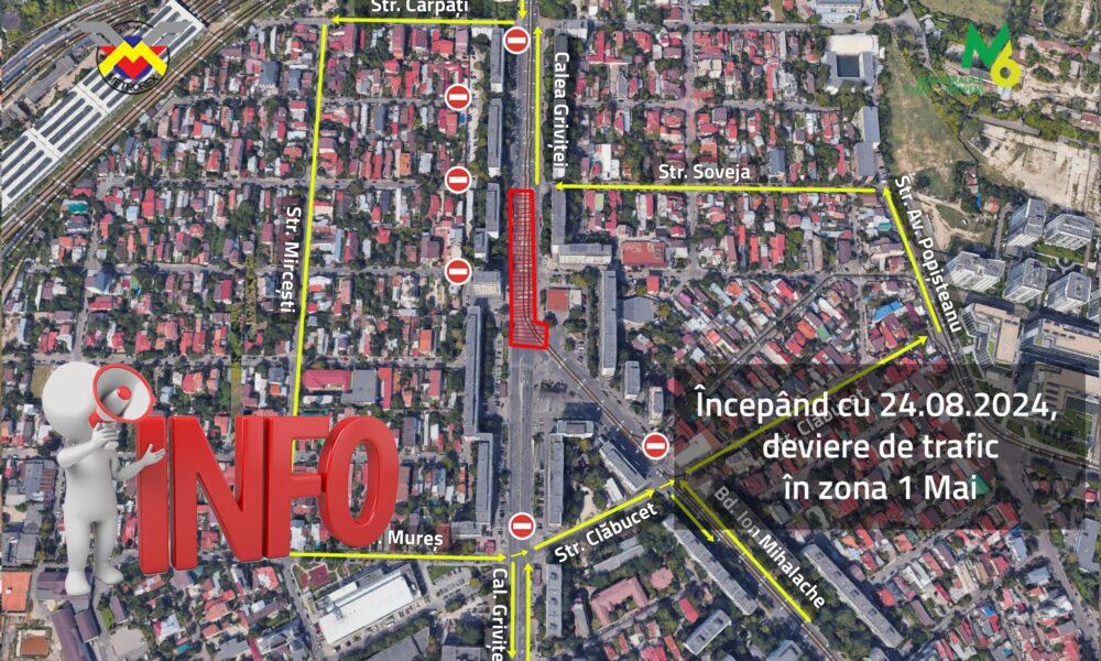 Metrorex anunță că în data de 24.08.2024, intervin restricții de circulație în zona 1 MAI, „prin devierea traficului din intersecția Calea Griviței – Bulevardul Ion Mihalache pentru activități pregătitoare la legătura cu actuala stație 1 Mai de pe aliniamentul viitoarei Magistrale M6, Secțiunea Sud, din cadrul contractului de execuție „Legătura rețelei de metrou cu Aeroportul Internațional Henri Coandă – Otopeni (Magistrala 6. 1 Mai-Otopeni). Proiectare și execuție structură de rezistență stații, galerii și tuneluri. Lotul 1. – 1Mai-Tokyo”.