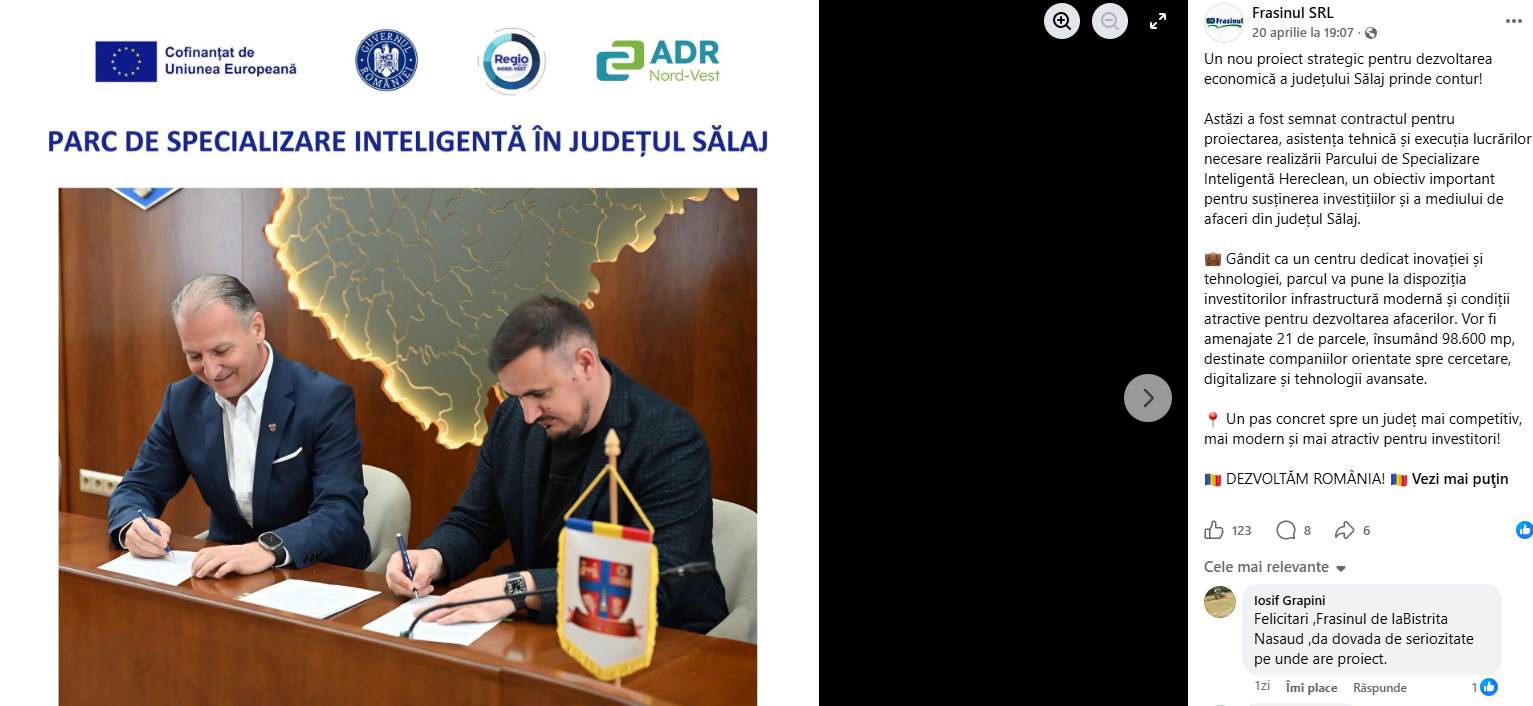 De asemenea, pe 20 aprilie apare o postare pe pagina de Facebook a companiei Frasinul SRL. Este anunțată semnarea unui nou contract pentru lucrări de realizare a Parcului de Specializare Inteligentă Hereclea.